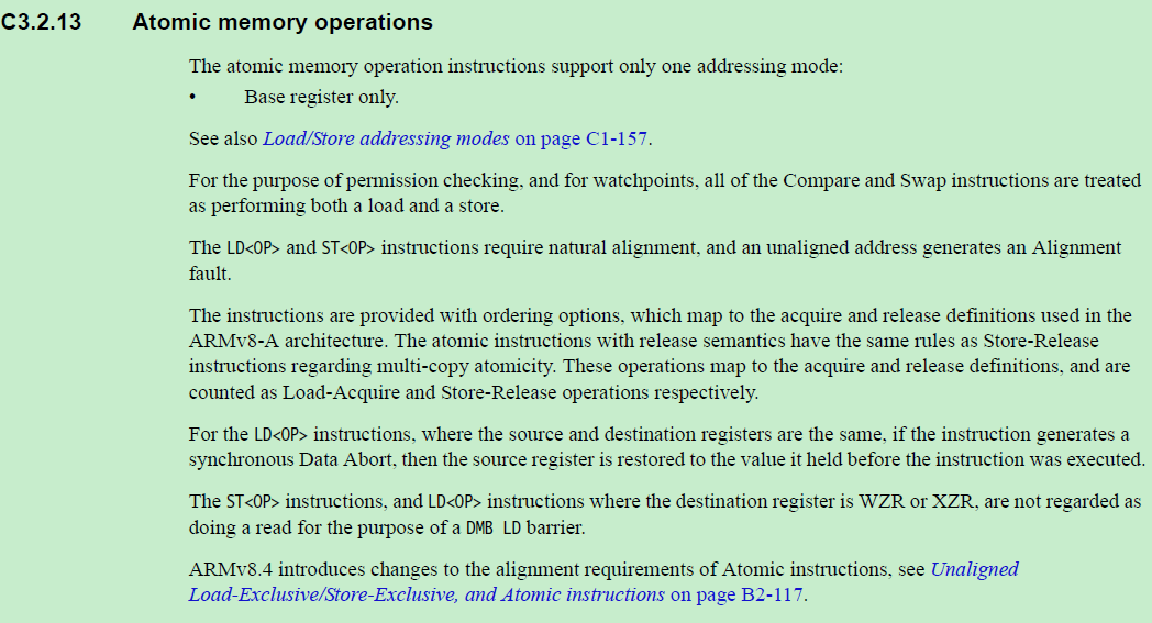 - 从上面可以看到,在ARMv8中, 对于cacheable memory, 原子操作都是没有问题的, 因为系统可以通过cache来完成原子操作.
