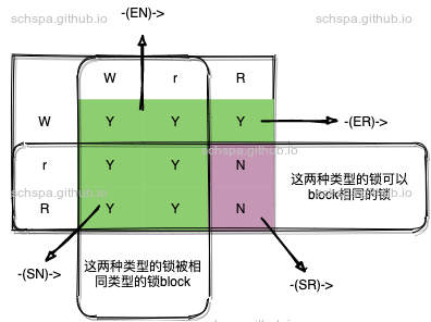 针对这三种锁类型,可以有如下几种的阻塞关系矩阵. Y表示行标会阻塞列标, N表示不会产生阻塞的问题