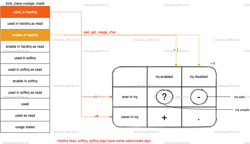 根据上面的9种状态,lockdep通过记录锁在获取时的上下文,以及中断开启状态,来机率锁的状态,每把锁可以在不同safe/unsafe的标签中转化