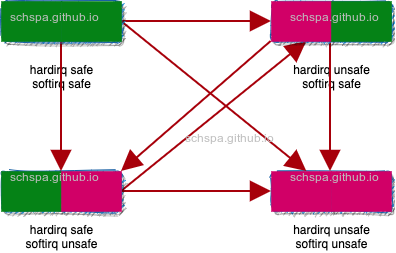 softirq/hardirq的safe状态可以用来判断持锁是否会有风险,入下图所示,红色箭头所表示的锁依赖顺序是有死锁风险的