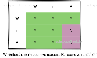 abbr type W/E exclusive lockers r non-recursive readers R recursive readers S all readers (non-recursive + recursive), as both are shared lockers. N writers and non-recursive readers, as both are not recursive.